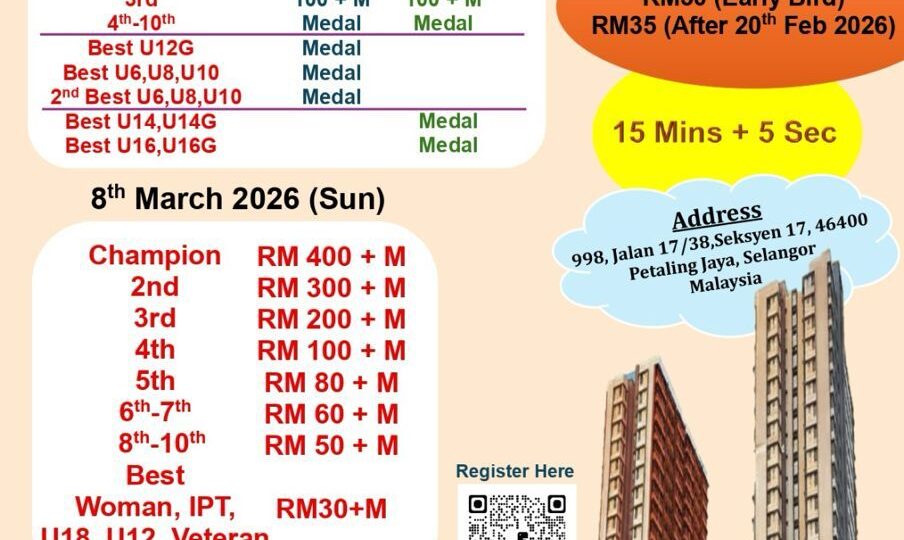 Get ready for the landmark 20th Malaysian Chess Festival 2025! That’s right the 20th edition !! This highly anticipated event, recognized as the region’s longest-running international open, will feature nine diverse tournaments over ten days. The festival runs from September 12th to 21st, 2025, at the KL Gateway Mall, Kuala Lumpur. It’s easily accessible via LRT.…